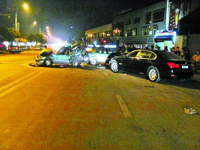 “11月1日那天是萬圣節(jié),酒吧生意特別好,我們10多輛車就在酒吧外等客。因為沒客人,我們幾個就站在車外聊天,沒想到一輛黑色的寶馬車一下撞上來了。我的車排在中間,被撞得最慘。”浙C·FT832出租車司機說,他的車被擠壓得完全變了形。