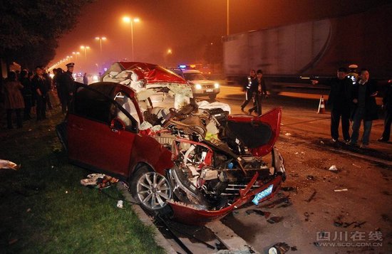 昨晚(25日)9時(shí)許,三環(huán)路南三段,一輛載了8個(gè)人的紅色世嘉與一輛大卡車發(fā)生嚴(yán)重追尾,車內(nèi)兩男一女當(dāng)場死亡,另外5人,包括兩名小孩傷勢(shì)不重,被送往市一醫(yī)院。