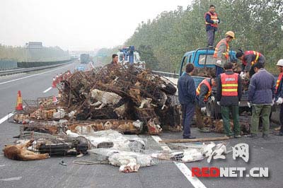 23日凌晨5時許,一臺中型貨車在京珠高速公路湖南段78公里側(cè)翻,貨車上運(yùn)載的兔子和狗在高速公路上到處亂竄,許多司機(jī)為避讓干脆將車停在超車道上。為保障交通安全,交警和施救人員只得在高速公路上四處抓捕、圈圍這些狗和兔子。