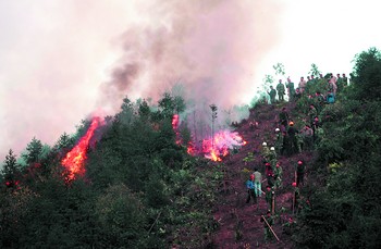昨日上午9時許,大風讓火勢再次蔓延。此時,600多名增援的武警、消防戰(zhàn)士、民兵預備役戰(zhàn)士迅速投入到山火的撲救之中。寬25米、長1公里的隔離帶剛剛砍伐成功,迅猛的火勢立即就蔓延過來。到上午11時,4條隔離帶相繼失守。常規(guī)的山火撲救方法已經無法奏效,只得重新布置兵力。20米的隔離帶被拓寬到了25米,三組人員同時展開戰(zhàn)斗。記者在現場看到,附近許多村民已將自家的電視機、桌子、衣被等物什全部搬至空曠地。