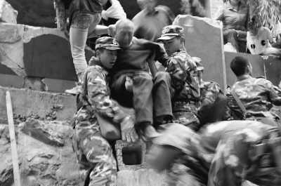 沒有受傷的普通群眾,很多也主動留下來參加搜救工作。沒有專業(yè)的救援工具,就用鐵鏟、鐵鍬,有人干脆從廢墟中揀起鋼筋加入營救。沒有擔(dān)架,就用門板抬起傷員,越過幾公里坍塌的山路,轉(zhuǎn)移到鄰近的城鎮(zhèn)進(jìn)行救治。