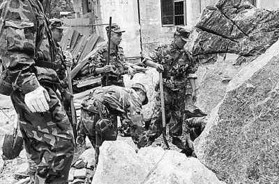 當(dāng)天凌晨,解放軍某部的2000余名官兵,一進(jìn)入綿陽市北川縣城,就開始了緊張的救災(zāi)工作。