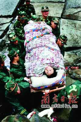 北川中學(xué),盡管教學(xué)樓已垮塌近兩天并經(jīng)受了多次余震,記者昨日還是不斷聽到廢墟中有學(xué)生呼救的聲音,說明被掩埋人員仍有生還希望。據(jù)估計(jì),這所中學(xué)死亡和失蹤的人數(shù)在1000人以上。