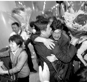 “我們終于活著回來了!弊蛲11點30分,首都1號航站樓,38名北京游客搭乘CZ3904航班平安抵京,迎接他們的是親人激動的擁抱和淚水。據(jù)了解,這38名游客是本市首個從四川災(zāi)區(qū)返回的大型旅游團,在成都開往九寨溝的途中,他們遭遇地震受困茂縣,度過了“與世隔絕”的56個小時。