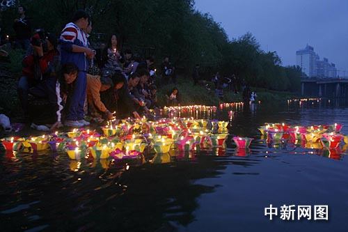 5月19日晚18時(shí)許,吉林市下了一天的小雨仍在纏綿不斷。此時(shí),已有四百多名市民自發(fā)地來(lái)到松花江邊,手撐雨傘,走到江水邊放河燈!拔覀兇蠹叶急е粋(gè)心愿,那就是為災(zāi)區(qū)的死難者哀悼,為受苦的同胞祈福!币晃17歲的學(xué)生對(duì)記者說(shuō),雖然下著雨,但為了盡自己的一份心意,她還是冒雨來(lái)到江邊。