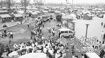 遠(yuǎn)遠(yuǎn)望去,上千頂帳篷密密地排在體育館四周的草坪和廣場(chǎng)上,體育館主場(chǎng)館外墻上,幾條橫幅醒目地掛著——“相互幫助相互關(guān)心,同船共濟(jì)共渡難關(guān)”、“黨和政府永遠(yuǎn)和人民心連心”。擴(kuò)音器里,除了播放尋親的啟事,就是反復(fù)地低唱著“讓世界充滿愛(ài)”的歌曲:“輕輕地捧起你的臉,為你把眼淚擦干……”