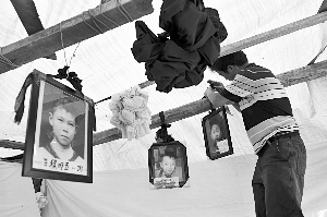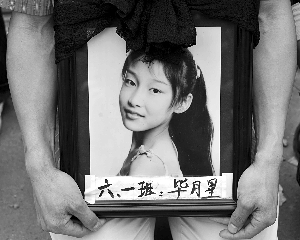 5月21日14時(shí),綿竹市富新第二小學(xué)(簡(jiǎn)稱(chēng)“富新二小”)的正門(mén)至坍塌校舍之間的道路上,擠滿了前來(lái)祭奠遇難學(xué)生的家長(zhǎng)們。捧于家長(zhǎng)胸前的相框內(nèi),是127張?jiān)?jīng)鮮活的臉。
