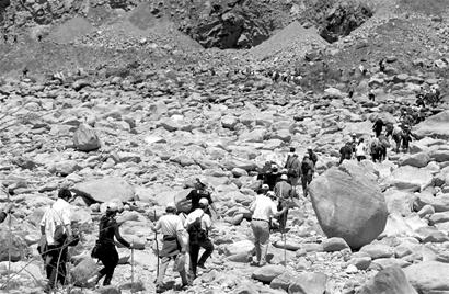 導(dǎo)游和師傅一前一后,護送著游客徒步往都江堰方向進發(fā)。在前行大約5公里后,公路路面已被滑落的山體及大量的石塊完全中斷。游客們只能手腳并用地翻過路障。其中很多老年人根本沒有辦法翻越兩米多高的石堆,于是師傅在后邊推、導(dǎo)游在上邊拉,總算通過了這段障礙。