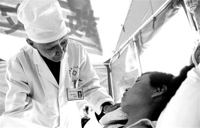 5月13日凌晨5時(shí),什邡市第二人民醫(yī)院1樓臨時(shí)手術(shù)室77歲的主治醫(yī)生張泮林剛做完地震后的第六臺(tái)手術(shù)。此時(shí),一名地震中受重傷的患者被送到了醫(yī)院!翱,立即手術(shù)!”張泮林來(lái)不及休息,立即開(kāi)始為患者做手術(shù)。突然,張泮林倒在了地上,心臟停止了跳動(dòng)。經(jīng)過(guò)全力搶救,1分鐘后,張泮林的心臟才又恢復(fù)了跳動(dòng)。1天不到,身體還沒(méi)有完全恢復(fù)的張泮林,又出現(xiàn)在搶救地震受傷群眾的第一線(xiàn)。