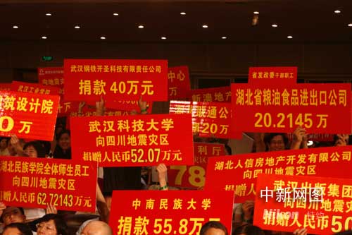 中新網(wǎng)武漢5月22日電 (記者 艾啟平)22日晚8點至11點,湖北省抗震賑災晚會《我們心相連》在武漢洪山禮堂舉行。在晚會現(xiàn)場,中共湖北省委書記羅清泉、湖北省長李鴻忠等帶頭為四川地震災區(qū)捐款,全省企業(yè)和社會各界及電視觀眾紛紛響應,截至晚會結(jié)束時共收到捐款超過一億元人民幣。