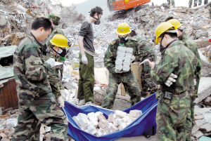 在長達6天的搜救過程中,北川縣日益成為危城。官兵們將資金、食品急送至鄰近的謝家坪村,那里有36戶受災群眾;18日,他們將大量群眾轉(zhuǎn)移至安全地帶……同時,他們冒著余震不斷、堰塞湖隨時可能決堤的危險晝夜作業(yè),先后3次緊急修改搜救方案,共救出9名幸存者,并于21日傍晚成功挖出金庫庫款。官兵們將廢墟中散碎的人民幣逐一收撿入兩個大袋子,5個存放大量現(xiàn)金的保險柜也被逐一發(fā)掘出來——18時20分,第一批資金被清點出來;19時20分,搜救工作結(jié)束,北川信用聯(lián)社620余萬元資金完好無損(如圖)!官兵們繼續(xù)搜尋,包括記錄資金信息的筆記本電腦、憑證等均被搶救出來。