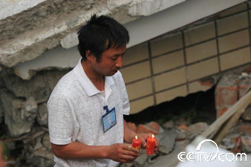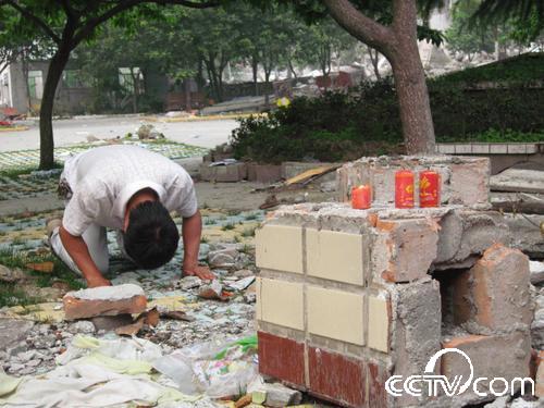 “孩子們,沒有全部救出你們我很內(nèi)疚,我會記住你們忌日的,每年的這一天我都會來看你們,給你們送學(xué)習(xí)用品。你們生前都很團結(jié),在天堂也要相互關(guān)照好,老師每天都在想念著你們!”在北川中學(xué)(新區(qū))的廢墟下,記者看到一名中年男子跪在地上,哭得很悲傷,還向遇難的同學(xué)叩拜。記者跑過去一看,此人就是北川中學(xué)的校長劉亞春。他告訴記者,地震后他一直在忙碌搶救學(xué)生的事,沒有時間來看望這些還埋在廢墟下的數(shù)百名學(xué)生。今天他在百忙之中,抽時間來看看這些孩子們,他將帶來的蠟燭點燃后放在廢墟下,雙手合十,默默地祈禱,然后跪在地上給在地震中失去生命的學(xué)生磕了三個響頭。