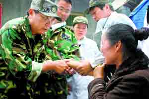 這邊的診斷才剛結(jié)束,那邊又傳來新的情況。有位年過八旬的老人跑過來,請醫(yī)生到帳篷里為自己的女兒診治。將軍二話不說,立即派出心胸外科主任李魯跟著村民坐上自己的越野車,直奔那位村民所住的帳篷!拔覀冞@個流動醫(yī)療隊就是這樣,沿途看到哪里有災(zāi)民居住的帳篷,就會過去詢問是否需要醫(yī)藥,使那些地處偏遠(yuǎn)或行動不便的群眾能夠得到醫(yī)療救助!