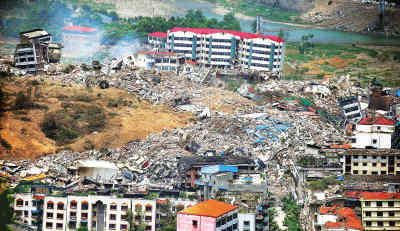 我們所到的地點(diǎn)是與汶川一山之隔的什邡沿山鄉(xiāng)鎮(zhèn),震后的災(zāi)區(qū)真是慘不忍睹!車進(jìn)什邡洛水地界,倒塌的房屋越來(lái)越多,到處是殘?jiān)珨啾冢叽蟮膹S房?jī)A斜了,一座加油站的一根柱子倒在地上,屋頂觸了地,公路中間是寬寬的裂縫,原本蔥蘢的青山上到處是滑坡留下的瀑布一樣的黃色道子。我還看見(jiàn),廢墟上擺放著三頂巨大的棺材,穿著白大褂的防疫人員正在深挖巨坑,并往里面一層層地灑白灰。
