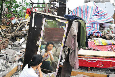 到綿竹漢旺鎮(zhèn),已是夜晚,黑魆魆中,一片片斷壁殘?jiān)b牙咧嘴,仿佛巨大的怪物。住在廢墟旁帳篷里的一家人告訴我,旁邊就是曾經(jīng)溫馨繁盛的家,曾經(jīng)經(jīng)營(yíng)著建材和婚慶禮品的家。如今兒子遇難,人去樓空。在火車站的廢墟上,一位老人顫顫巍巍地說(shuō):“這下面曾經(jīng)埋葬了10多個(gè)人,上午見(jiàn)面還笑嘻嘻,下午就……”這10多個(gè)人被挖出來(lái)時(shí)都是一個(gè)姿勢(shì):一手捂頭,一手伸向前方,仿佛要擋住轟然倒塌的巨物……