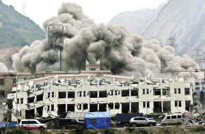 5月27日,映秀鎮(zhèn)對(duì)一棟樓房進(jìn)行爆破拆除,以進(jìn)一步打通去汶川的公路。