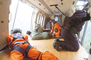 得到前線救援人員通過海事衛(wèi)星報告的消息后,27日下午,救援直升機冒著危險,在距地面10米的空中展開搜索!翱矗旅嬗腥擞!”飛機盤旋了很久,但因當?shù)赜幸慌琶芗母邏壕,飛機無法降落,眼看大霧越來越濃,救援直升機只得返回廣漢機場待命。