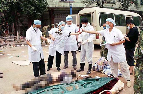 解放軍戰(zhàn)士不懈地挖掘,用雙手搬開(kāi)大大小小的磚頭和石塊似的水泥碎塊,兩臺(tái)大型機(jī)械不停地工作,不時(shí)有遇難者尸體從廢墟中被發(fā)現(xiàn)。戰(zhàn)士們把這些尸體抬到路邊,有人專門噴灑消毒粉劑,然后我們便為死者清洗面部,以便家屬辨認(rèn),視聽(tīng)技術(shù)人員拍照。無(wú)家屬辨認(rèn)的尸體,我們就從尸體肋部取下一塊軟骨放進(jìn)預(yù)先備好的固定液瓶里編號(hào)保存。挖出的尸體大多數(shù)都已變形,有的肢體殘缺,腐爛嚴(yán)重,操作者不得不戴上防毒口罩。