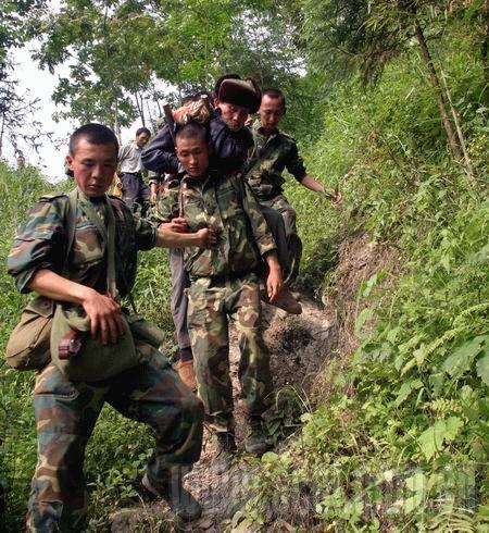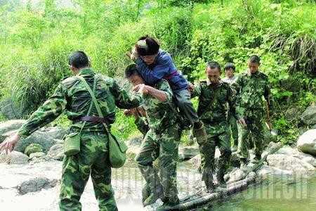 一大早,我們160人每人背著40公斤給養(yǎng)、物資、器材開始翻越這座大山。政委說,茶坪老百姓需要我們。在翻越一個(gè)峭壁時(shí),列兵侯軍腳下一滑摔倒了,旁邊就懸崖,慶幸的是,除背囊隨著山石滾下山崖,侯軍本人安全地爬了起來。九個(gè)小時(shí)后,我們終于到達(dá)茶坪鄉(xiāng)。茶坪鄉(xiāng)副鄉(xiāng)長張平一見到我們,就撲通一聲跪在了參謀長面前說:“人民子弟兵來了,茶坪就有希望了……”參謀長一把將他扶起,兩個(gè)漢子都淚流滿面。