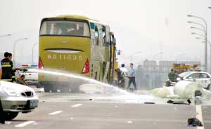 昨天下午4時,記者趕到事發(fā)現(xiàn)場,看到大巴車停在第二車道,車子后部地下有兩三個破裂的白色油桶,地上淌著許多綠色液體,還在冒著縷縷青煙。大巴兩側(cè)車窗已經(jīng)破碎,車頭的擋風玻璃也已破裂呈蜘蛛網(wǎng)狀掛在車頭,車下有火燒過的黑色痕跡。