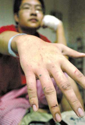 “車子被撞后,司機馬上停車打開車門,我們都往下跑,車里在冒煙,車身外還起了火,坐在中后部來不及跑下車的學生抽出隨車鐵錘擊碎玻璃,從車窗內(nèi)跳下逃生。”番禺區(qū)人民醫(yī)院內(nèi),一位姓杜的華農(nóng)學生躺在骨科病床上向記者描述。