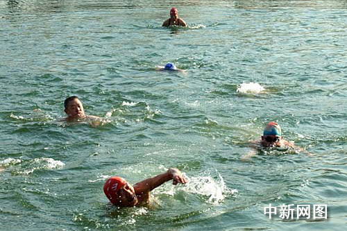中新網(wǎng)濟(jì)南1月1日電(記者 張榮容 見習(xí)記者 趙金鵬)2009年的第一天,全國第二屆冬泳大賽在山東省城濟(jì)南大明湖景區(qū)內(nèi)舉行。來自北京、天津、山東濟(jì)南、東營、濱州等省市的17支代表隊(duì)116名冬泳愛好者相聚濟(jì)南大明湖畔,不畏零下8攝氏度的嚴(yán)寒,以冬泳的方式迎接新一年的開始。