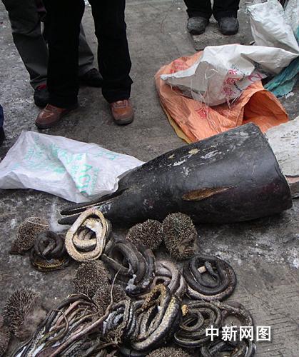 1月3日下午,吉林市林業(yè)局稽查支隊20名工作人員來到位于吉林市東市附近的市場,在一家沒有掛牌的店里,查獲出一只珍貴的海豚頭和近千條野生錦蛇、刺猬等野生動物。記者在現(xiàn)場看到,錦蛇和刺猬已經(jīng)凍僵,千余條錦蛇藏在帆布下。