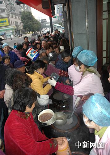 杭州河坊街的施粥情況也有過之而無不及。據(jù)了解,包括方回春堂在內(nèi)的幾家老字號都集中在臘八這一天向杭州市民免費派送臘八粥!盀榱四軌蛟谂D八這一天盡早喝到臘八粥,我們幾個老兄弟從昨天晚上12點不到就守在這里了,可是沒想到竟然還有人比我們早!币呀(jīng)喝到熱騰騰的臘八粥的王大爺興奮地說。記者在現(xiàn)場看到,等候施粥的市民隊伍從方回春堂出口出發(fā),一直延伸到了吳山廣場,占據(jù)了整整一條河坊街。