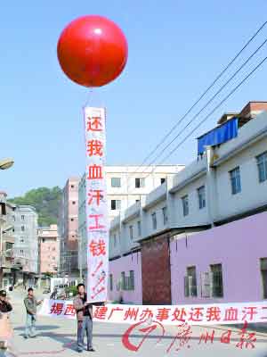 昨日上午,在廣從公路黃莊一帶,一中年男子買來(lái)一個(gè)紅色大氫氣球,升起條幅,意欲向包工頭追討3萬(wàn)余元報(bào)酬。