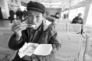 昨天11:00,記者來到中央門汽車站,站前廣場上空無一人。前天還像煮餃子一樣的候車大廳,只有稀稀拉拉的幾十個人。下午3:20左右,車站端出了為旅客精心準備的“年夜飯”:一鍋餃子,共40碗分盛給站內(nèi)的每一位旅客。一位前往南通的老漢邊吃邊笑呵呵地說:“好吃,真好吃!15:40,隨著南京到南通的最后一班車徐徐駛出,車站歸于了平靜。年前的春運就這樣順利落幕了,沒有一名旅客滯留在車站。車站人士介紹,昨天一天的客流量約在5000人次,僅是24日的1/12。