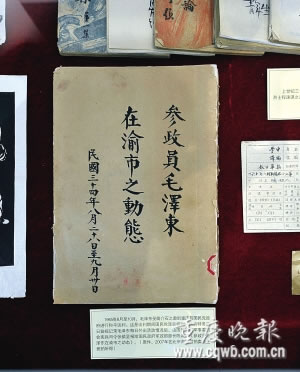 今年正值中共中央南方局成立70周年,紅巖革命紀(jì)念館展出了一本泛黃的手抄本,封皮上赫然寫(xiě)著:參政員毛澤東在渝市之動(dòng)態(tài)。紅巖聯(lián)線文化發(fā)展管理中心主任厲華透露,該書(shū)系60多年前敵特對(duì)毛澤東的監(jiān)視記錄,該館花18.5萬(wàn)元在北京拍得。
