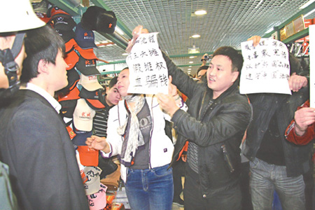 2月8日上午9點(diǎn)半,北京秀水街市場(chǎng)有限公司依據(jù)北京英特普羅知識(shí)產(chǎn)權(quán)代理有限公司向其提供的一份公證書,以涉嫌售假為名,準(zhǔn)備對(duì)市場(chǎng)內(nèi)的7家商戶進(jìn)行封攤處罰。但在場(chǎng)商戶卻手持公證處的一份“證明”,強(qiáng)烈質(zhì)疑英特普羅代理公司出具的售假公證存在“證據(jù)不足”,并與市場(chǎng)管理人員和保安發(fā)生沖突。
