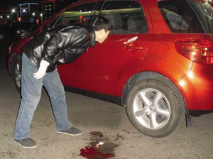 在一知情者的帶領下,記者找到了死者事發(fā)時乘坐的轎車。這是一輛紅色長安鈴木轎車,車的左側后座門把手上方,一個長約10厘米的大口子清晰可見,大口子已透過轎車鋼板,足見當時進入車內煙花的威力之大。轎車后座的靠背上,還留有一大攤血跡。