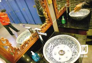 廁所里面布局大體和普通廁所一致,不同的是,洗手池是高檔的青花瓷,而且還多出了專供殘疾人士和母嬰專用的兩個隔間。隔間的門是紅色木雕門(男廁為藍色),且是明清風格的兩扇拉門,其上雕刻細致,圖案精美,連拉環(huán)的做工都很逼真,記者感覺,進去如廁就好像進了一個古時候的廂房。