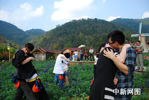 其時,數(shù)十對年輕戀人在紫色薰衣草“海洋”中以最深情最特別的花式親吻“大曬幸!保瑥摹膀唑腰c水”到“居高臨下”、從“天旋地轉(zhuǎn)”一直到“深情熱吻”,各有捧場客,頓時贏得了現(xiàn)場游人的陣陣掌聲和歡呼聲。