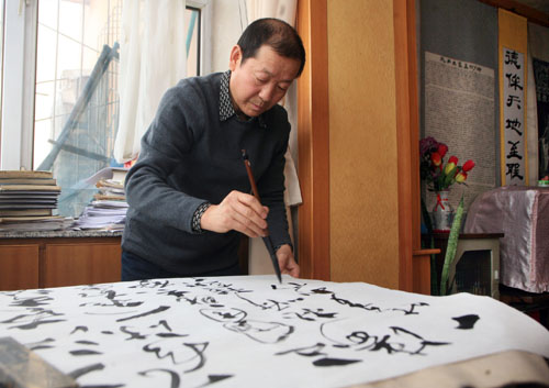 記者在烏市昆侖東路孔祥福家看到,客廳正中間的墻上掛著一幅十多年前他從山東孔府帶回來的孔子碑拓畫像。畫像四周的墻壁上,還掛著別人的或他寫的關(guān)于論語、家族的字畫。