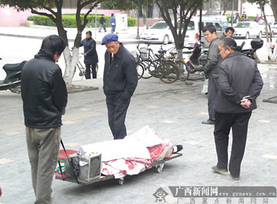 25日中午,一位靈川縣城的讀者致電本報桂林新聞熱線稱,她今天上午經(jīng)過靈川商貿(mào)城門口,看到一名年輕女子推著一架推車,上面躺著一具“尸體”。“尸體”用一床毯子嚴嚴實實地從頭包裹,只露出兩只腳。中午她再經(jīng)過那里時,發(fā)現(xiàn)推著“尸體”的變成了一個小伙子了。這種乞討方式太恐怖了,很多人繞道走,當然也有人施舍錢。
