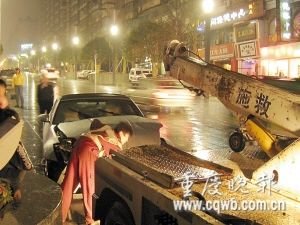目擊者劉先生介紹,9時(shí)50分左右,當(dāng)事尼桑跑車從北城天街方向飛馳著上行,駛向江北歐式一條街。在歐式一條街中段,尼桑失控,撞向路邊的路燈電桿!芭椤钡囊宦曧懞螅姉U“巍然不倒”,尼桑車卻來了個(gè)180度的大轉(zhuǎn)彎。當(dāng)晚10時(shí)10分左右,記者在現(xiàn)場看到,這輛車牌號為渝AE3183的尼桑跑車車頭被撞得四分五裂,路面上散落著車燈,鐵皮等碎片。目擊者劉先生說,事發(fā)后,車上兩人毫發(fā)無損,但下車后不知去向。