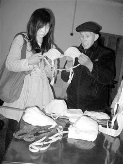 傍晚,大爺在桌子上堆起一大摞成品胸罩,都是樣品。大爺說:“從4寸到8寸的都有,你看這做工!”“我只懂A杯、B杯啊!”說完這話的劉梅,看到大爺一臉茫然。傳統(tǒng)的尺寸和現(xiàn)代的“杯標(biāo)準(zhǔn)”成為老少兩代人的第一道難題!熬褪菑淖钚〉阶畲舐,簡單,下來慢慢換算!3人和冉大爺?shù)溺蹆合敝艽蠼阋黄鸺?xì)化即將開始的工作。周大姐當(dāng)“打工”,兩個(gè)同學(xué)負(fù)責(zé)把信息上傳貼吧并建起一個(gè)網(wǎng)店!25-80元一個(gè),純棉面料環(huán)保,手工制作個(gè)性,對于一大一小或單邊的客戶更是長項(xiàng)!边@是他們初步的網(wǎng)絡(luò)宣傳詞。