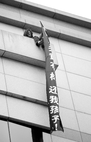 記者看到,一名身穿紅色外套的年輕女子,正坐在樓頂外墻伸出的一小塊天臺邊緣,垂著頭發(fā),兩腳懸空,一只手抓著手機(jī),另一只手拉著一條條幅,上面寫著“還我孩子”等幾個白色大字。圍觀的人越來越多,記者回頭望去,只見淮海路一側(cè)的自行車道上,整片黑壓壓的腦袋。