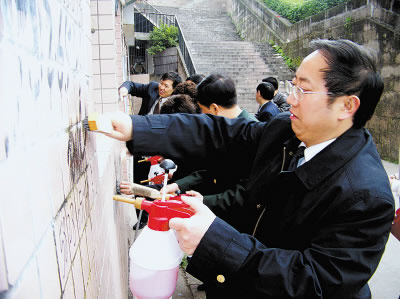 手拿刷子、噴水槍和抹布,公務(wù)纏身的書記、縣長(zhǎng)親自動(dòng)手清除城市“牛皮癬”。3月13日,一網(wǎng)友在大渝網(wǎng)三峽吧發(fā)出的帖子《云陽(yáng)書記縣長(zhǎng)走上街頭清除“牛皮癬”何需親歷親為?》,引發(fā)網(wǎng)友熱議。有網(wǎng)友不解,書記和縣長(zhǎng)何必在百忙之中對(duì)此“小事”親歷親為。從山東到云陽(yáng)交流任職的云陽(yáng)縣委書記李洪義昨日介紹說(shuō),云陽(yáng)縣正在創(chuàng)建國(guó)家衛(wèi)生縣城,他希望通過自己的行為,號(hào)召大家一起關(guān)心城市環(huán)境。