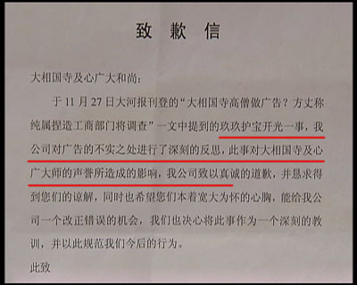 在電視廣告中,玖玖理療褲被吹的神乎其神,說能包治百病,各種疑難雜癥不在話下,那么,在這種神奇的背后,玖玖理療褲究竟隱藏著怎樣的秘密呢?我們從商場了解到,很多消費(fèi)者看了前面的廣告之后,不僅買了理療褲,還為了得到一張由河南開封大相國寺高僧開光的玖玖護(hù)寶,寧可再多掏20塊錢,再買一件玖玖背心,開封大相國寺是著名的佛教圣地,這里的高僧真的會(huì)為推銷玖玖理療褲而走進(jìn)廣告嗎?一起來來看看事情的真相。