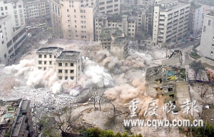 “5、4、3、2、1,爆破!”8點(diǎn)整,在總指揮的命令下,只聽(tīng)見(jiàn)一聲巨響,6棟樓同時(shí)轟然倒下,眨眼工夫就淹沒(méi)在濃煙中,僅用時(shí)1.5秒。隨即,消防車(chē)開(kāi)始噴水控制揚(yáng)塵。