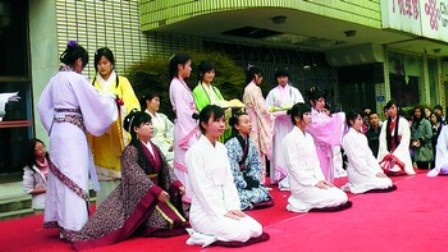 古時女子在15歲都有成人禮,謂之“笄禮”,是女性一生中最重要的禮節(jié)之一,可與婚禮并重。昨日下午,湖南師范大學(xué)五舍廣場前上演了“時空錯位”的一幕:三名妙齡美眉身著寬袍大袖的漢服,在一大群穿牛仔褲、T恤,手持數(shù)碼相機的大學(xué)生圍觀下,集體接受了成人禮。據(jù)悉,這是湖南首次集體舉辦女子漢服成人禮。