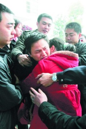 昨日下午4時(shí)05分左右,陰雨綿綿,在長(zhǎng)沙市看守所,當(dāng)犯罪嫌疑人唐斌被警方押出大門(mén),其身懷六甲的妻子撲到他懷里痛苦失聲時(shí),他流下了悔恨的淚水。