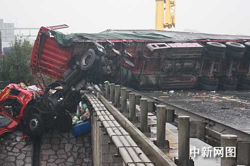 今天凌晨,一輛金華牌照的大掛車在經(jīng)過(guò)衢州與常山交界處附近的芳村溪大橋時(shí),車輛忽然發(fā)生側(cè)翻,掛車車頭撞壞中央護(hù)欄伸出橋外,掛車車身橫向?qū)⑼鞣较蜍嚨廊孔钃,事故車輛上裝載有硫酸、氫氟酸等多種危險(xiǎn)品,其中部分危險(xiǎn)品發(fā)生泄露。