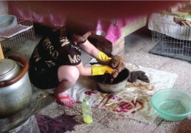 貴婦狗每染過一次顏色就加深一些,漸漸接近褐紅色,魏某笑著說:“你看神奇吧,貴婦就慢慢變成泰迪了!彼f現(xiàn)在狗市上做過活的狗很多,但是做完后都不會拿到狗市里的正規(guī)店鋪里賣,只在散市賣!斑@樣賣出去人找不到你,比較保險”。