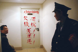 4月3日中午,東三環(huán)華騰園9號樓17層的居民張女士走出家門后,迎面看到鄰居門上的幾個紅色大字:“欠債還錢 還!還!還!”