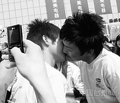 網友Luochen725發(fā)貼:前天下午,我剛好在路橋富仕廣場附近逛街,聽說有接吻大賽,就過去湊熱鬧。不看不知道,一看不得了,兩個男人在接吻,汗,有兩對,頓時被雷倒了!他們還按主持人的要求擺不同的姿勢,熱吻了一個多小時,我暈!情侶參加活動可以接受,不過對我來說,這么多人看著,覺得比較怪。而兩個大男人這么大庭廣眾之下接吻,我就真的是無語了。