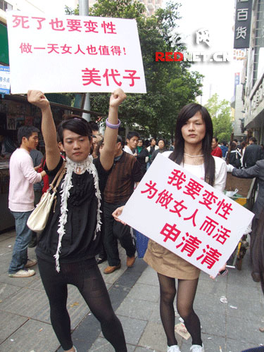 今日(4月13日)下午13時(shí)左右,記者收到網(wǎng)友線索,長(zhǎng)沙黃興路步行街有兩個(gè)怪人舉著“我要變性”的標(biāo)牌,圍觀的市民把路口堵個(gè)水泄不通。記者隨后趕到,發(fā)現(xiàn)其中一人正是前段時(shí)間頻頻曝光的“準(zhǔn)”變性人申清清,另一個(gè)“怪人”則自稱“美代子”。